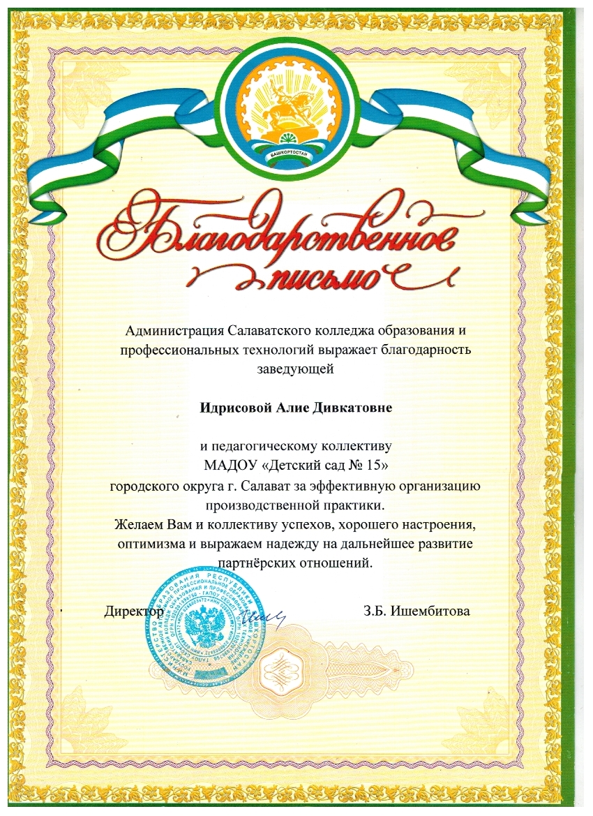 Благодарственное письмо от Администрации Салаватского колледжа образования