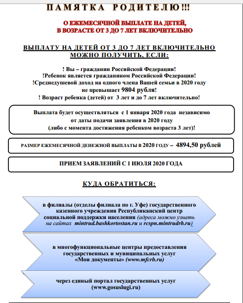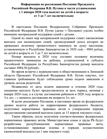 Информация по реализации Послания Президента РФ В.В.Путина в части установления с 01.01.2020г. выплат на детей в возрасте от 3 до 7 лет включительно